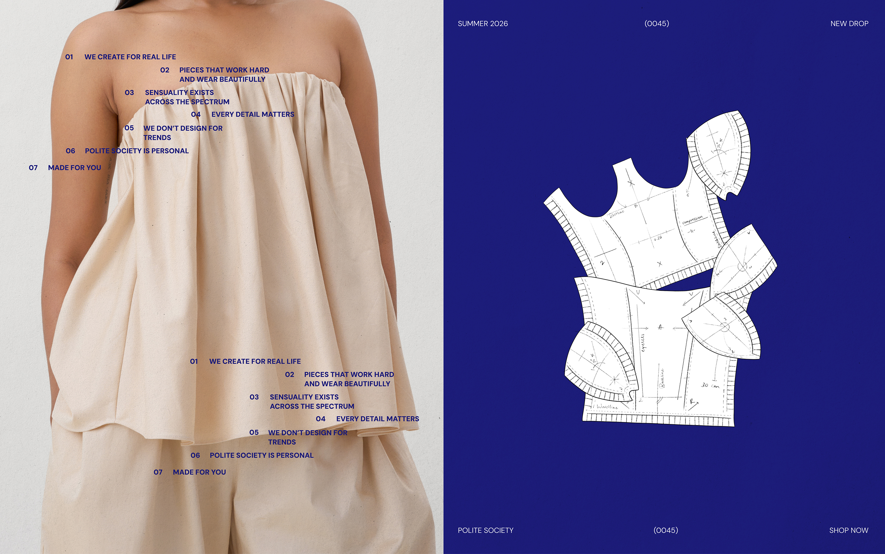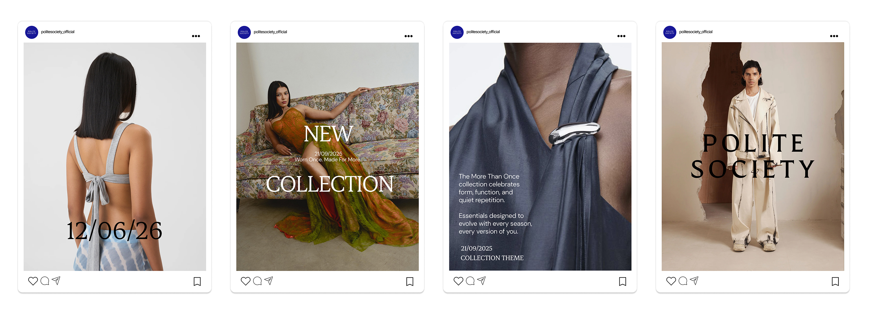 The refresh for Polite Society focused on refining the brand’s core design elements to better reflect its philosophy of sensuality, authenticity and non-conformity. Rather than a full rebrand, the approach was intentionally subtle - strengthening the existing identity while bringing greater clarity and cohesion to how the brand presents itself.