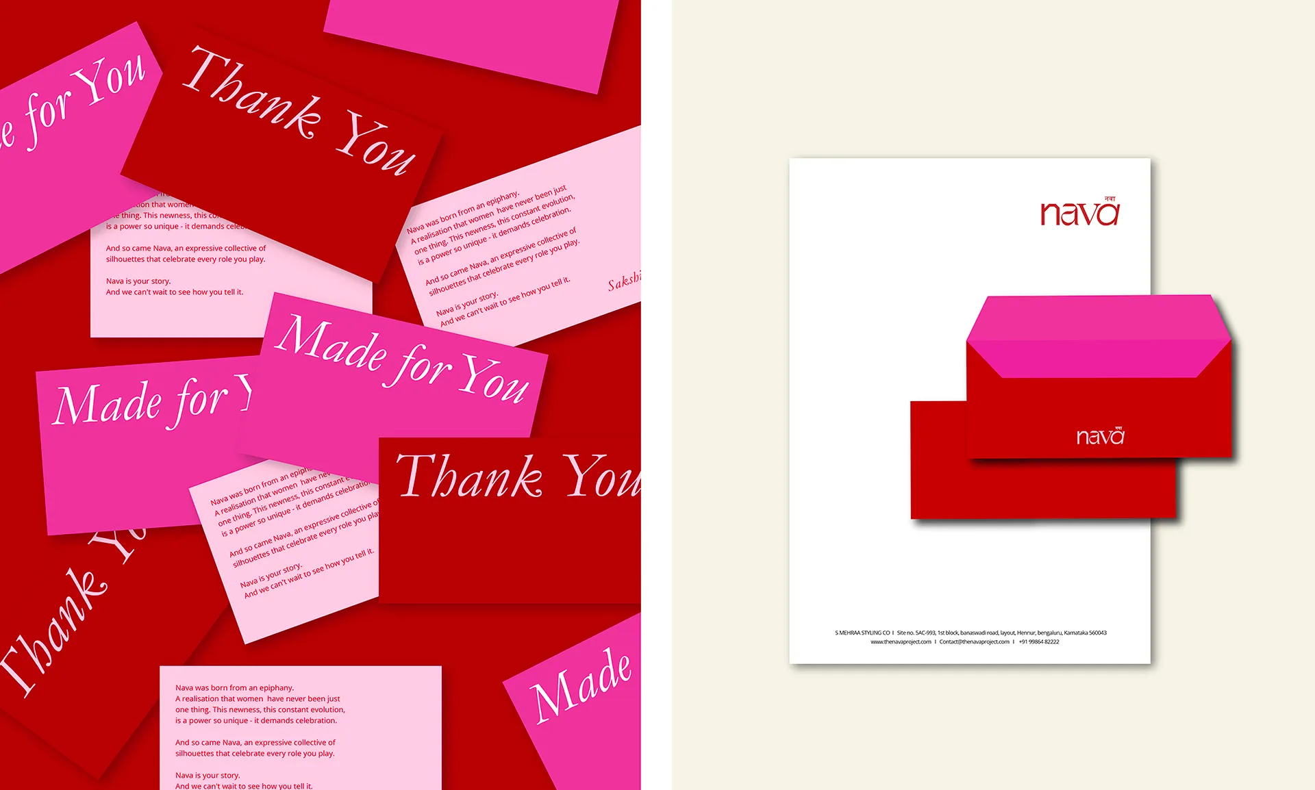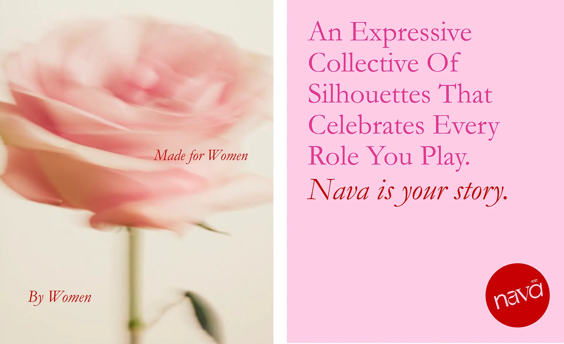 The logo symbolizes diverse body types and the multifaceted roles women take on, reinforcing the brand’s inclusive and dynamic nature. The bold yet minimal color palette strikes a balance between confidence and elegance, mirroring the strength and adaptability of its audience. A carefully curated palette of pinks and reds further represents this balance—blending traditionally feminine and masculine tones to capture the duality at the heart of Nava.
