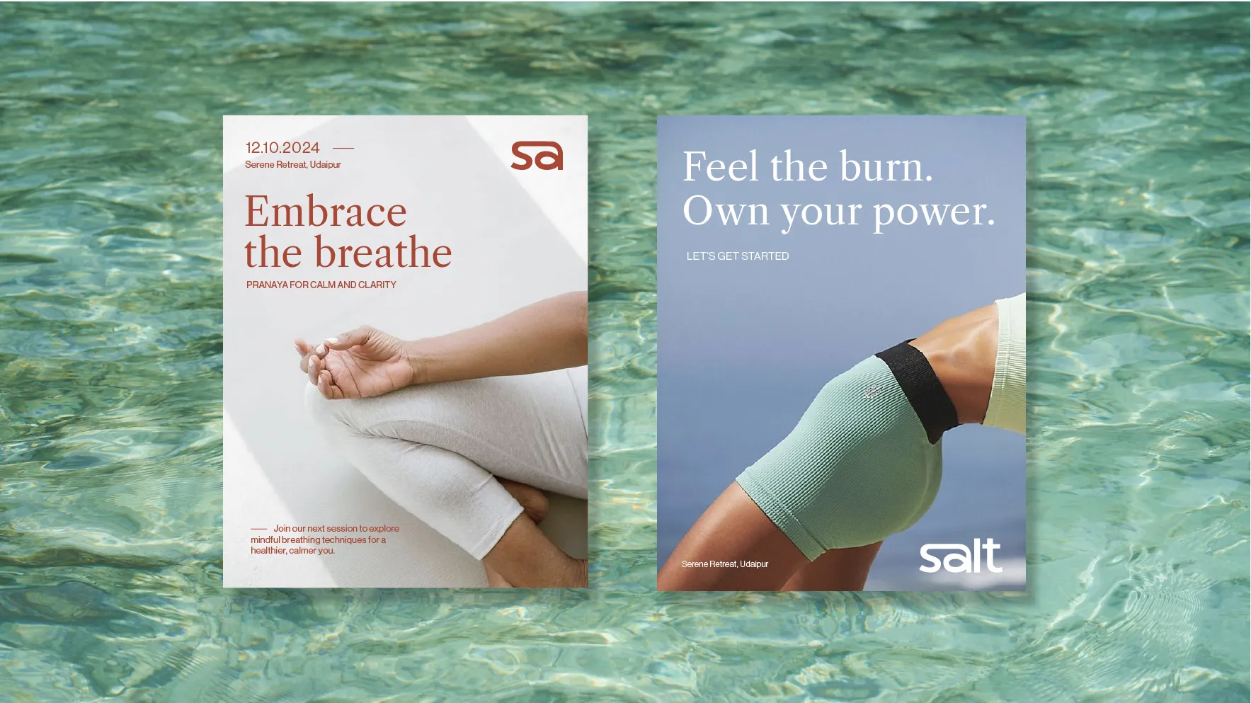 At the heart of the brand is a custom word-mark that seamlessly functions as both a logo and a symbol of flow and movement, achieved through the thoughtful integration of the “s” and “a” letterforms. By embracing visual restraint and intentional negative space, we amplified the impact of the typography and colour palette. The resulting design harmonises fitness and wellness, shaping a grounded brand identity that transcends the studio environment.